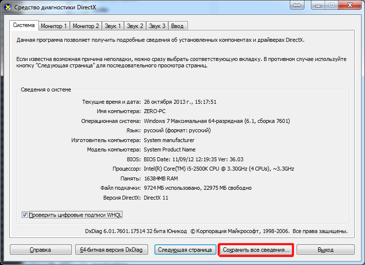 3. Должно запуститься средство диагностики DirectX. В этом окне нажимаете "Сохранить все сведения...":